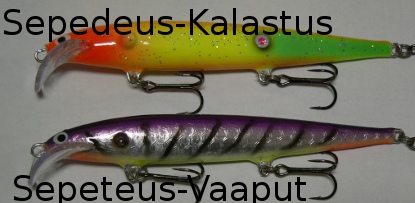 Sepedeus-kalastuksen kotisivuille. Olen kalastanut koko ikäni ja tehnyt vaappuja noin 15 vuotta. Kysynnän kasvaessa päätin tehdä kotisivut, mikä helpottaa vaappujen saantia asiakkaille. SM - kisoissa 2013, kaikki saamamme kalat oli Sepeteuksien uhreja, melkein 84 000 pistettä ( 28 kuhaa ja 12 haukea) , jotka olisi riittänyt kolmanteen sijaan henkilökohtaisessa kilpailussa. Joukkueena saimme SM-hopeaa Kuvassa kesällä 2013 saamani tuplatärppi Sepeteus - Vaapuilla, kuhat 5,7 kg ja 8,3 kg Seppo Happonen Sepedeus@dnainternet.net ( In English ) |